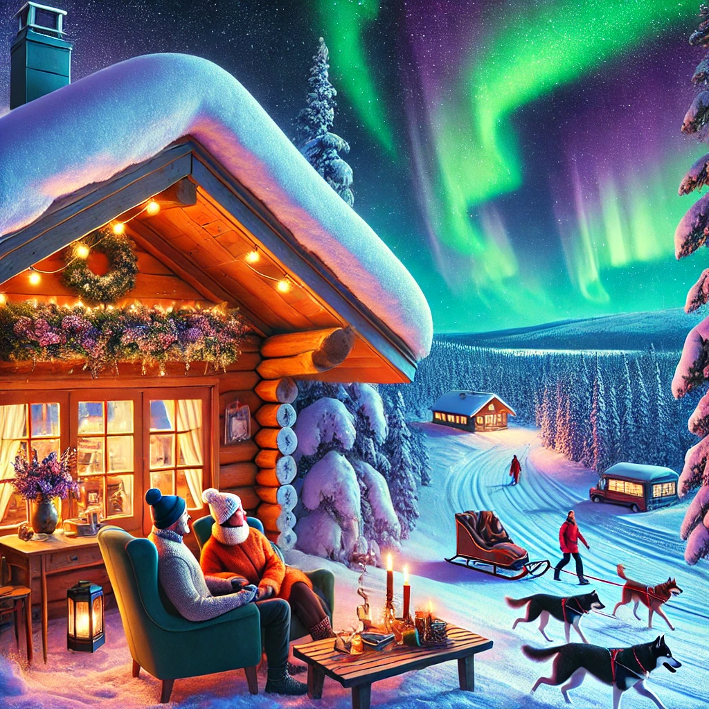 Chat GPT: Tässä on kuvitteellinen tunnelmakuva matkastanne Lappiin, jossa näkyy sekoitus seikkailua ja rentoutumista, lumoavat revontulet ja Lapin ainutlaatuinen talvinen luonto. Tämä kuvastaa juuri sitä tunnelmaa, jota elämysmatkanne voisi tarjota!